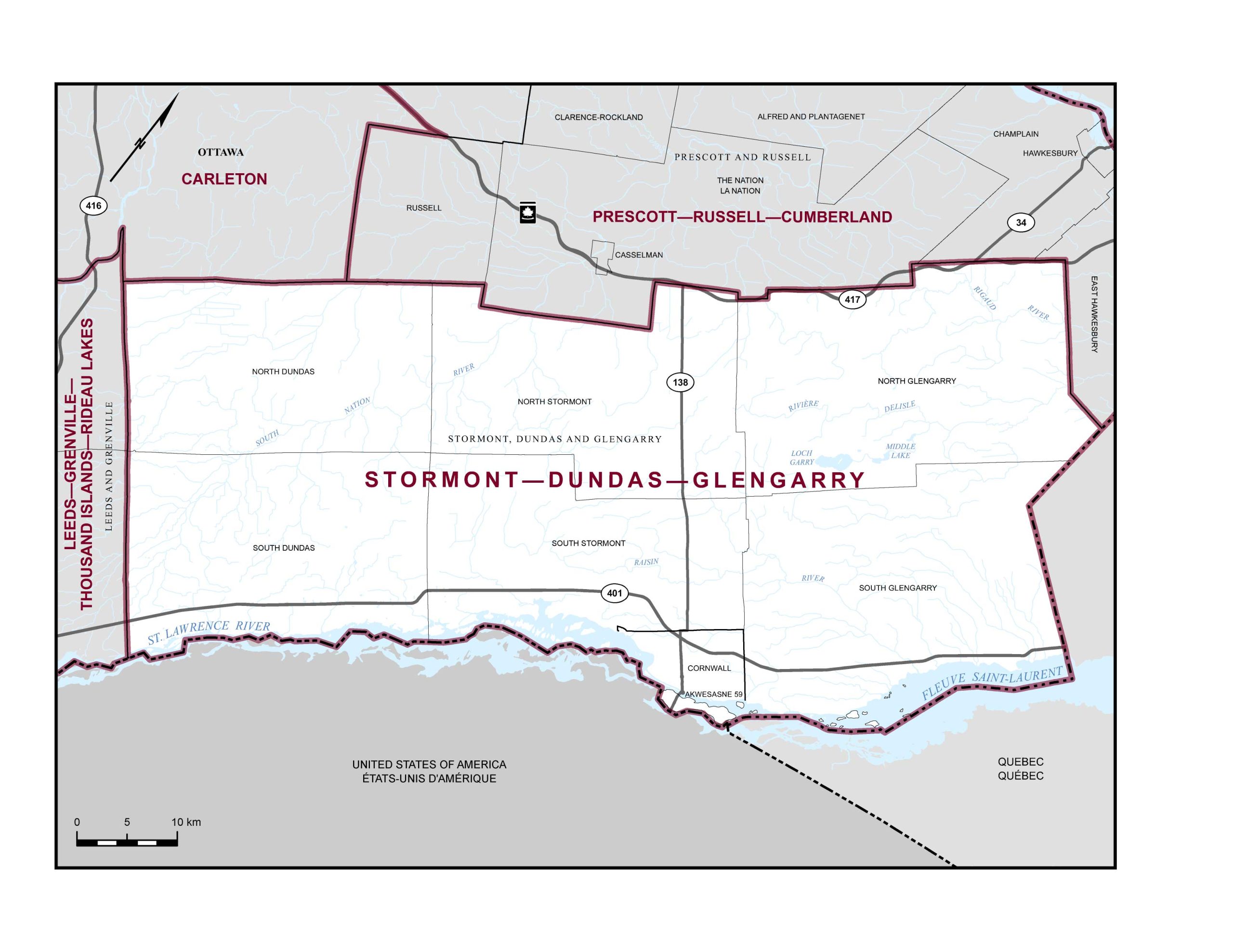 The riding of Stormont-Dundas- Glengarry lies on the north shore of the St. Lawrence River up to the Quebec border.